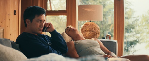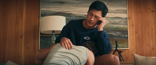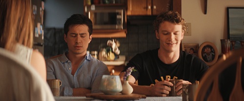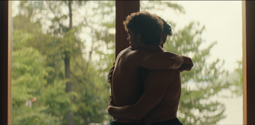 Mais, dernier twist, alors qu’ils reviennent tranquillement vers la maison en se demandant quoi manger, pâtes ou hot-dogs, et Ilya veut le hot-dog, mais, il ne le sait pas encore, il aura des pâtes, un plan subjectif de l’intérieur du cottage nous alerte : quelqu’un les regarde. Les deux garçons n’ont rien vu, ils s’embrassent donc contre la vitre et le mouvement de la caméra nous confirme en nous faisant passer derrière ce quelqu’un. Ilya le voit alors et s’écarte de Shane, mais trop tard. Contre-champ qui nous montre, ou nous confirme pour celleux qui l’avaient reconnu, qu’il s’agit de David, le père de Shane, qui semble paniquer et s’en va immédiatement sans que son fils, pris de court aussi, n’ait le temps de le retenir.